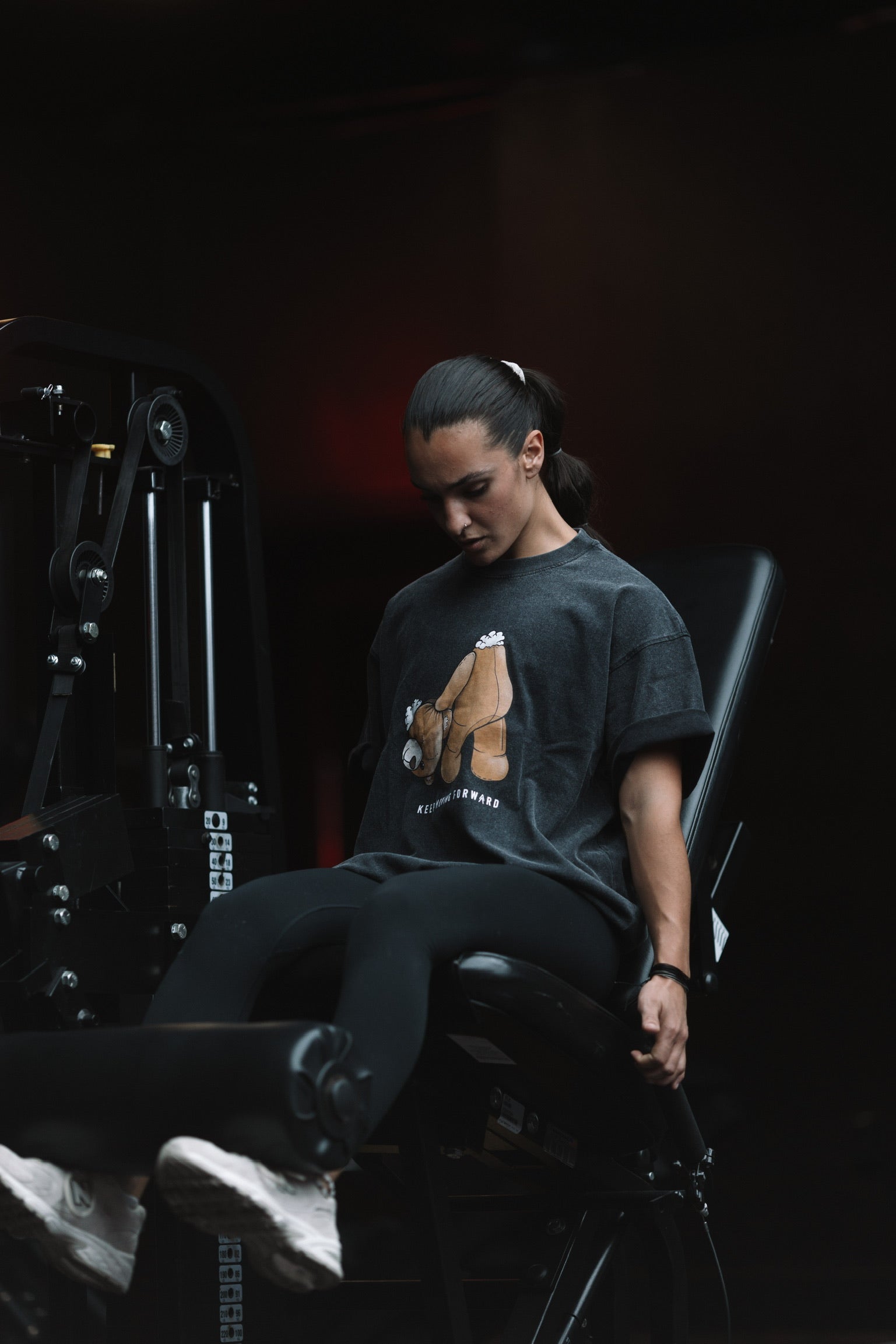 DESIGN: Baggy tee features our unique Keep Moving Forward teddy design. Comes in washed black & cream fit with custom embroidery on the back collar.